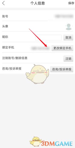 2、进入个人信息菜单栏中,点击更改绑定手机按钮。