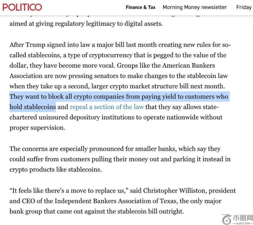银行游说团体还盯着加密货币稳定币那点收益,不让你碰。他们散布恐慌言论,说要是没了储蓄账户这门「吸血」的生意,整个金融市场都会崩盘!