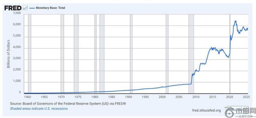 基础货币供应量叫 M 0,就是现金和银行准备金。你看危机时它涨得多猛,整体趋势就是一路向上