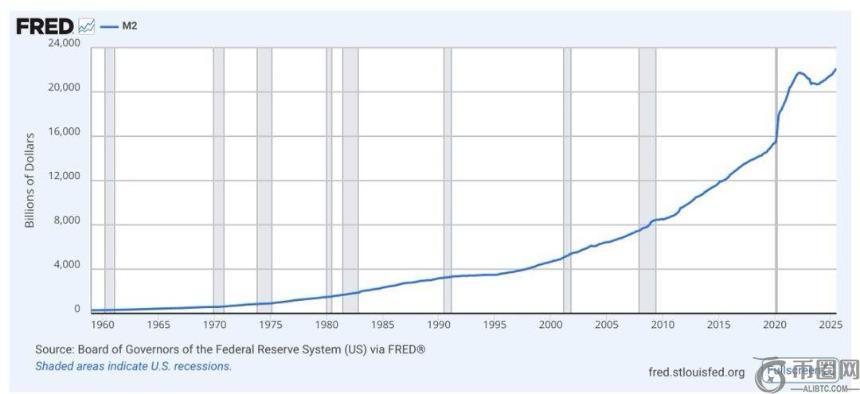 美元的发行量几乎从未被提及。经济学家只盯着通胀和购买力,但从长期来看,货币供应量增加会让美元相对于资产贬值。印的美元越多,你手里的钱就越不值钱。