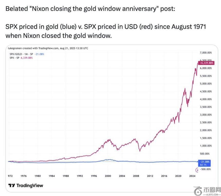 标普 500 以美元计算,1971 年以来涨了 6339%;但以黄金计价,标普 500 反而跌了 21%