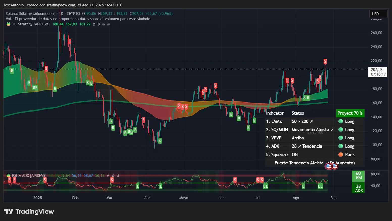 比特币 和 以太坊市值领先的加密资产——Solana 和 Coinbase——均实现了约 2% 的小幅上涨,推动整体市场再次突破 3.9 万亿美元。Solana 在各大加密货币中处于领先地位,过去 24 小时内上涨了 8%,目前交易价格超过 209 美元。SOL 能否保持这一势头?