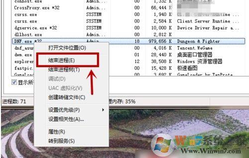 3、然后我们在里面找到DNF.exe*32这个进程,我们鼠标右键点击一下,如图所示。然后我们在选项卡中点击【结束进程】,将这个游戏进程关闭掉,因为我们其它方法,这个情况很难关闭,如图所示。