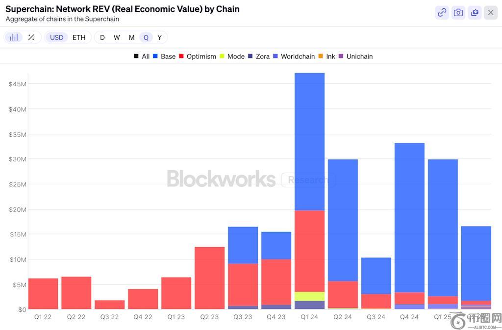 Unichain、Ink 和 Worldchain 所占份额要小得多,目前在费用收入图表上看起来就像是小点。