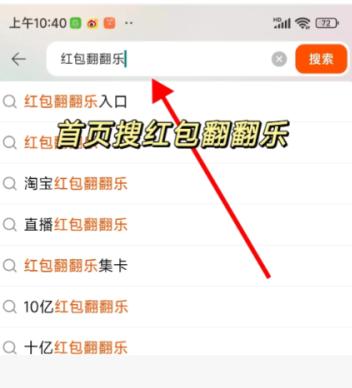 1,打开淘宝app,在顶部导航栏的位置搜索【红包翻翻乐】,点击搜索;