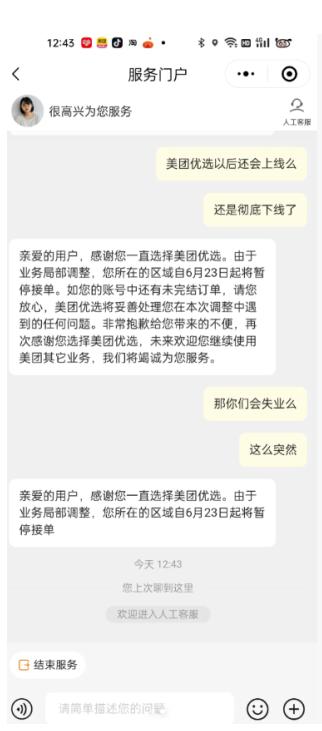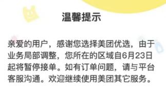 目前美团优选发布通知:亲爱的用户,感谢您选择美团优选,由于业务局部调整,您所在的区域自6月23日起将暂停接单。如有订单问题, 请与平台客服沟通。欢迎继续使用美团其它服务