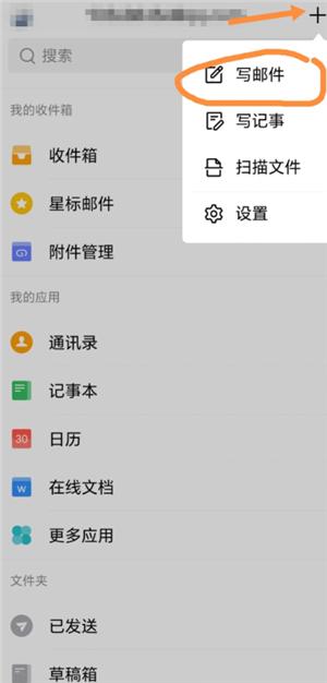 2.点击右上方“+”,点击“写邮件”进入编辑页面
