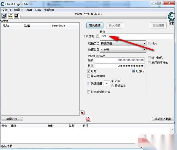 3、然后输入一个游戏中已经有的项目的数值修改的数值,再按首次扫描。