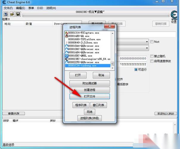 2、在弹出的进程列表窗口中找到你要修改的程序或是游戏,或是点击“打开文件”选择自己要修改的游戏进程(一般是exe格式)。