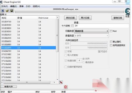 4、这时左侧会出现一些地址,看一下数字如果很多,不好判断,需要切换到游戏让该项目数值发生变化,然后再次扫描,直到只有一两个地址为止。