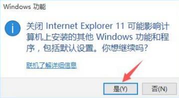 5、这时系统会提示“关闭Inetrnet Explorer 11可能会影响计算机上安装的其他Windows功能和程序”,点击“是”,再点击“确定”,如下图所示。