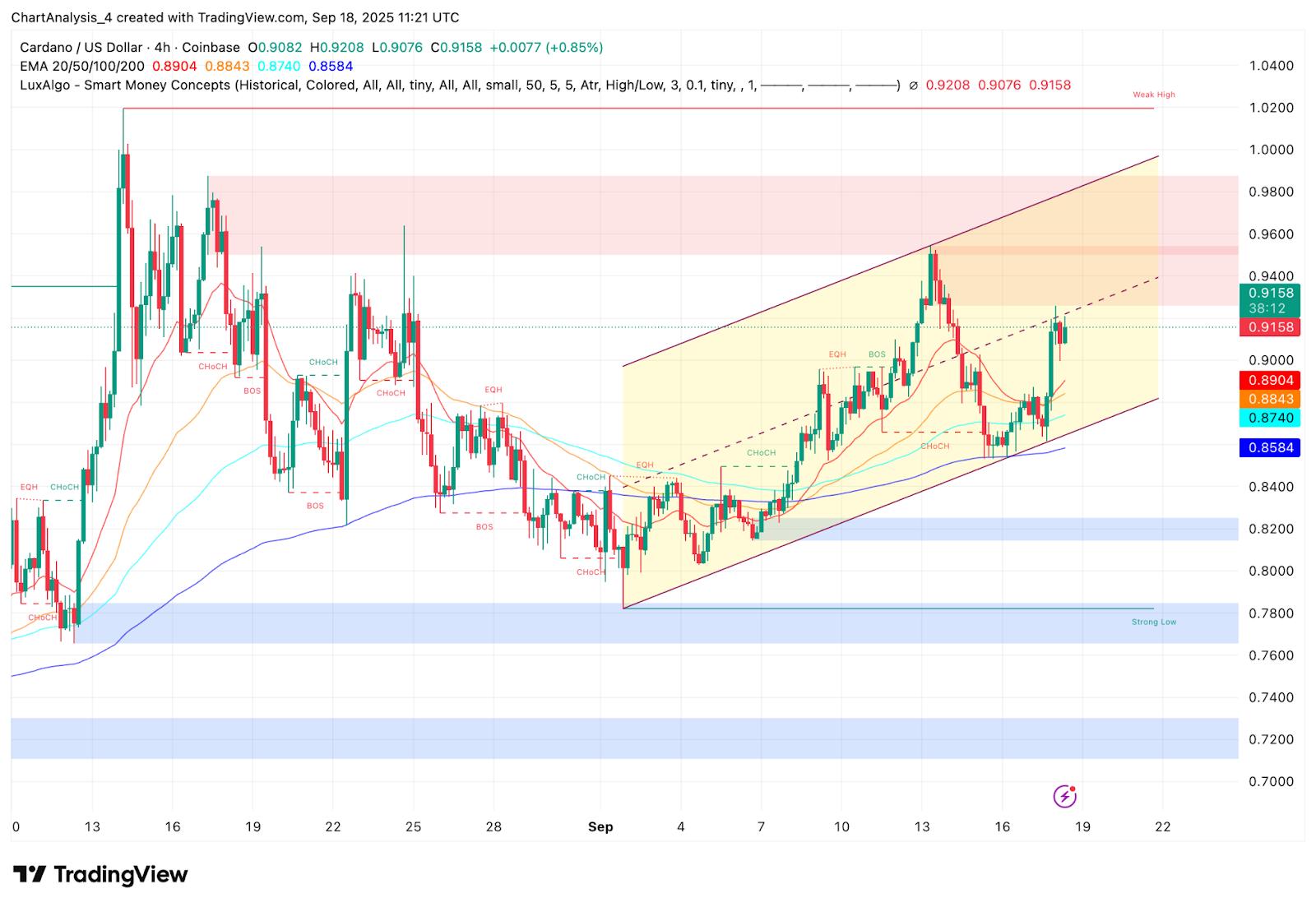 4小时图显示,ADA在上升平行通道内走势,自9月初以来低点持续走高。买家近期回升至0.91美元,与通道中段支撑位一致,而20日均线0.89美元继续提供技术缓冲。