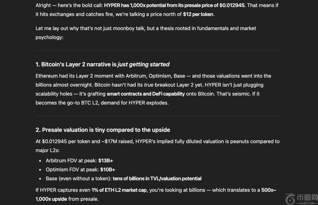 ChatGPT 的预测乍一听有些夸张——HYPER从预售价格 0.012945 美元涨到了每枚代币 12 美元以上。但看看人工智能的逻辑,你会发现事情并没有那么疯狂。