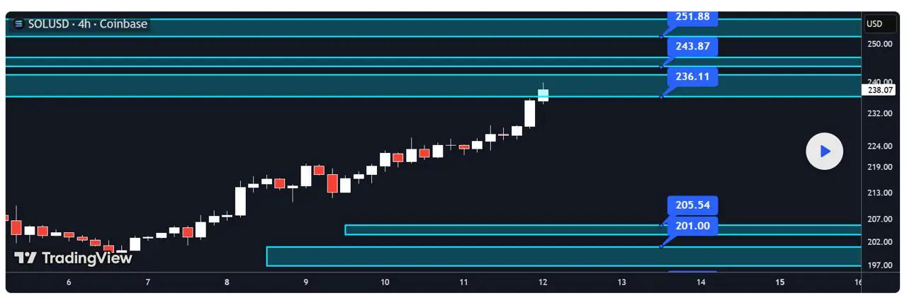 SOL 目前的交易价格约为 240 美元,关键技术区域和机构流动创造了乐观情绪。