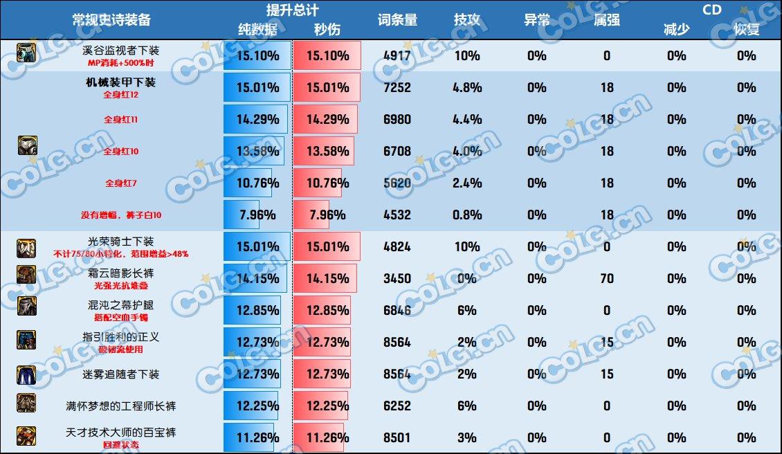 下装部位的常规史诗整体强度其实挺差的,一般在13%~15%。目前使用率最高的机械腿其实也是收益很不稳定的一个部位,并不是所有人都是取最高值,尤其是新手玩家,强度上可以称为版本陷阱,不能看别人这么搭自己也很随意这么搭。使用是有条件的。