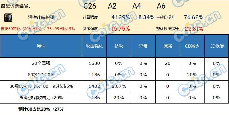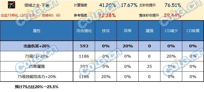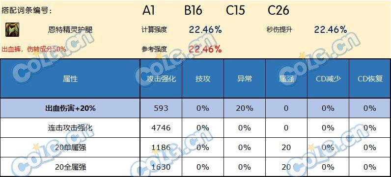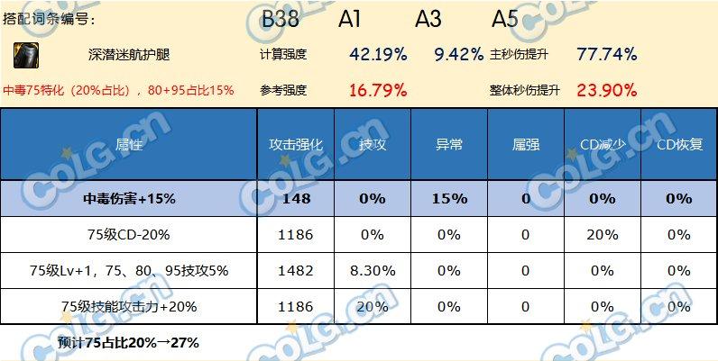 如果不想走中毒,比较开放的体系,引入等级词条的影响的话,这里考虑的是80级特化。因为其他部分收益是一致的,而80级的等级词条收益高于75级。数据上看即使是80级特化,长线秒伤效率(上限)也不尽如人意。这个数据只能在半血体系下有点竞争力了,毕竟半血低血没有合适的其他自定义。考虑到80的另一个部件是恩特上衣,是偏向低血半血体系的,因此这条裤子大概确实就是这么配套比较合适了。所以这里也没给出对80级的搭中毒15%的方案。75级想搭半血体系的,也可以参照这个方案估算强度。