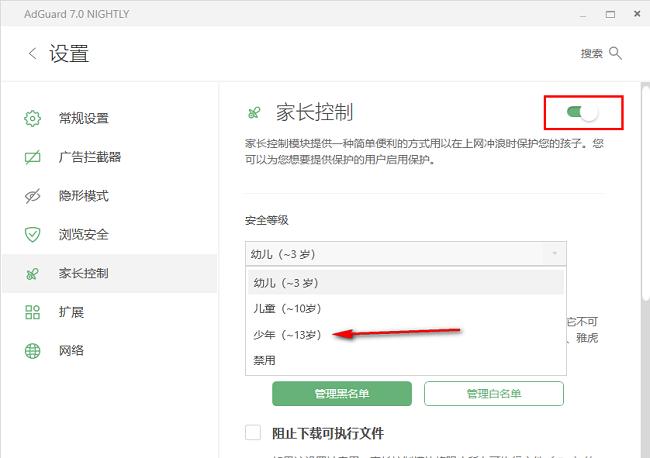 3、接着找到右侧中的"家长控制",将其开关按钮打开,并设置一个合适的安全等级的儿童年龄范围。