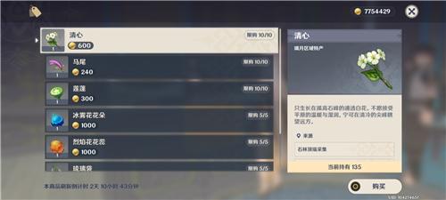 第一个商品就是清心了,价格为600摩拉一朵,一次性最多只能买10朵,每三天刷新一次。