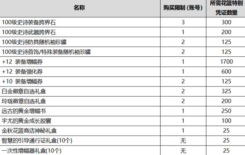DNF2020金秋花篮可以兑换100级史诗装备跨界石,100级史诗武器跨界石,100级史诗防具随机袖珍罐,100级史诗首饰/特殊装备随机袖珍罐,+12装备增幅券,+12装备强化券,+10装备增幅券,白金徽章自选礼盒,玲珑徽章自选礼盒,远古的黄金增幅书,尤的黄金成长胶囊,金秋花篮商店神秘礼盒,智慧的引导通行证礼盒(10个),一次性增幅器礼盒(10个)。