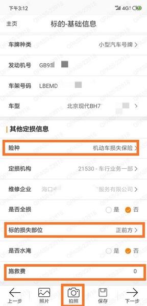 1、信息录入后,点击底下拍照按钮,开始对车辆所示部位进行确定(也可先拍后点选相册上传)。
