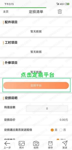 上传完照片后,进入下一步“定损平台”,开始配件、工时项目录入。