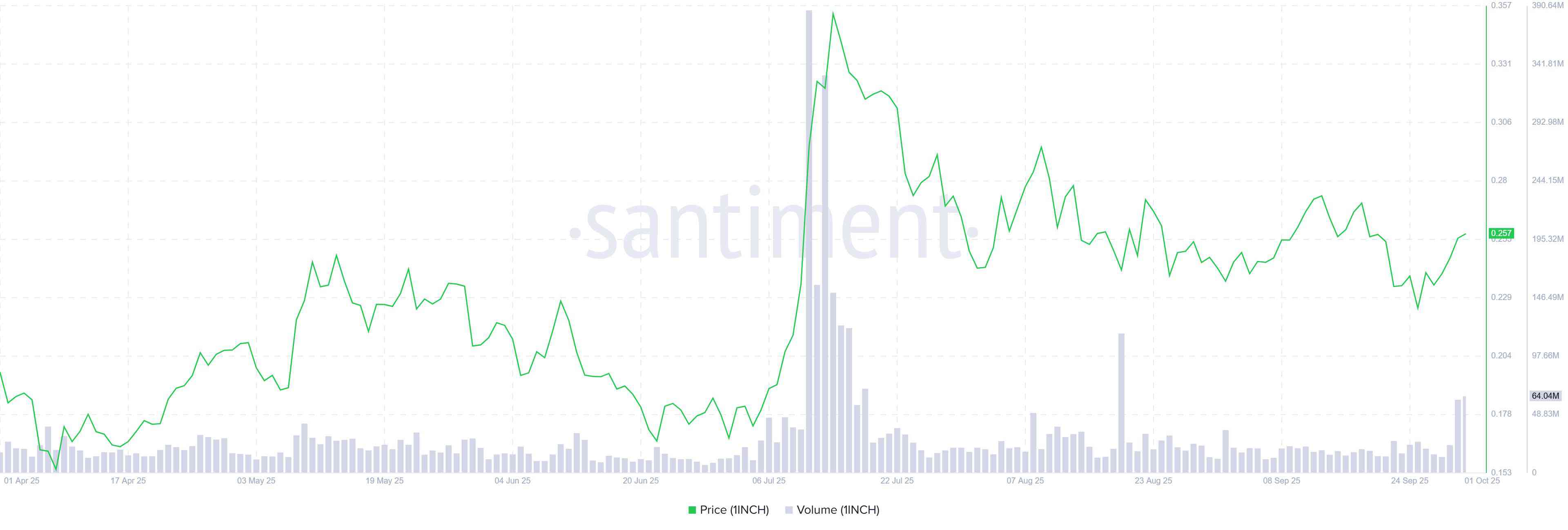 另一个支撑该平台看涨前景的因素是近期交易者对 1inch 的兴趣和流动性激增。Santiment 数据显示,1INCH 的交易量从周二的 1335 万美元飙升至周三的 6404 万美元,创下 8 月 20 日以来的最高水平。