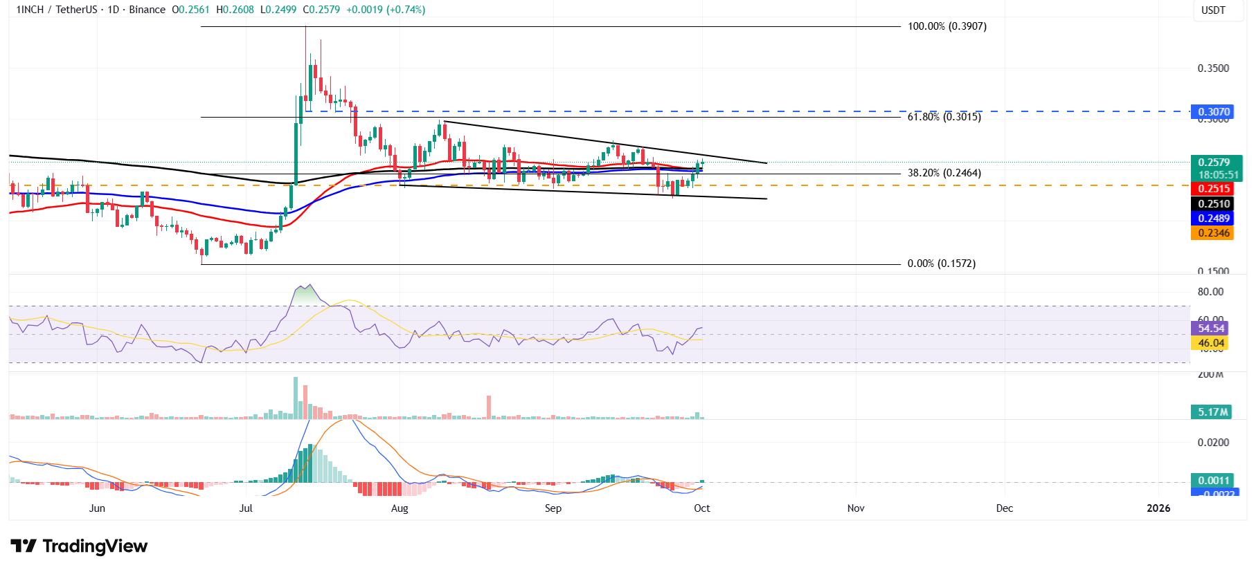 截至周三撰写本文时,1英寸(1INCH)价格在日线图上处于下降楔形形态内,位于0.257美元附近。突破这一延续形态将有利于多头仓位。看涨前景近期市场下跌期间,部分持有者增持了 1INCH 代币,同时交易量也不断上升,进一步支撑了这一趋势。技术指标随着上涨势头增强,也预示着可能出现突破。