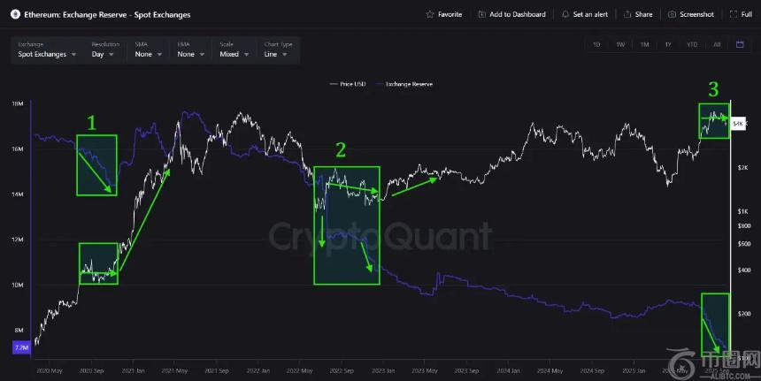 以太坊近期再次显现出一个熟悉的链上信号,这一信号在过去曾多次预示着价格的爆发式反弹:交易所储备降至新低,而市场价格却维持稳定。