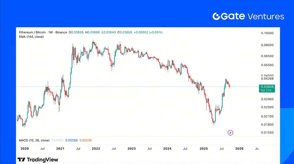 The Bitcoin Fear & Greed Index climbed from 50 (Neutral) last week to 71 (Greed), signaling a notable improvement in market sentiment. The ETH/BTC ratio edged slightly lower to 0.366, indicating BTC’s continued relative strength. (7)