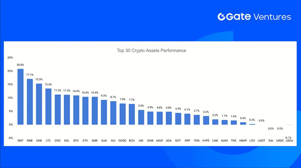 BNB followed with a 17.1% surge, fueled by the continuously growing enthusiasm around theBNBChain ecosystem and its Catalyst campaign, where memecoins like $4, $1, and $GIGGLE have reignited on-chain trading activity.