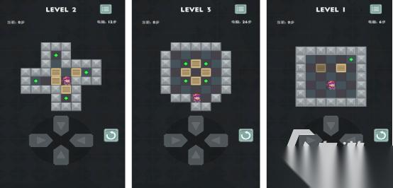 简单的屏幕中,会看到被随机摆放的箱子,而在屏幕上又有4个绿色的亮点,核心的要求就是操控其中的小人,通过合理的规划方式,将箱子推在指定的位置上,屏幕的下方,都有上下左右控制的按键,点击屏幕时即可推动箱子,但唯一需要注意的就是箱子只能推动一次,一旦遇到无法移动的情况,就会导致游戏失败。