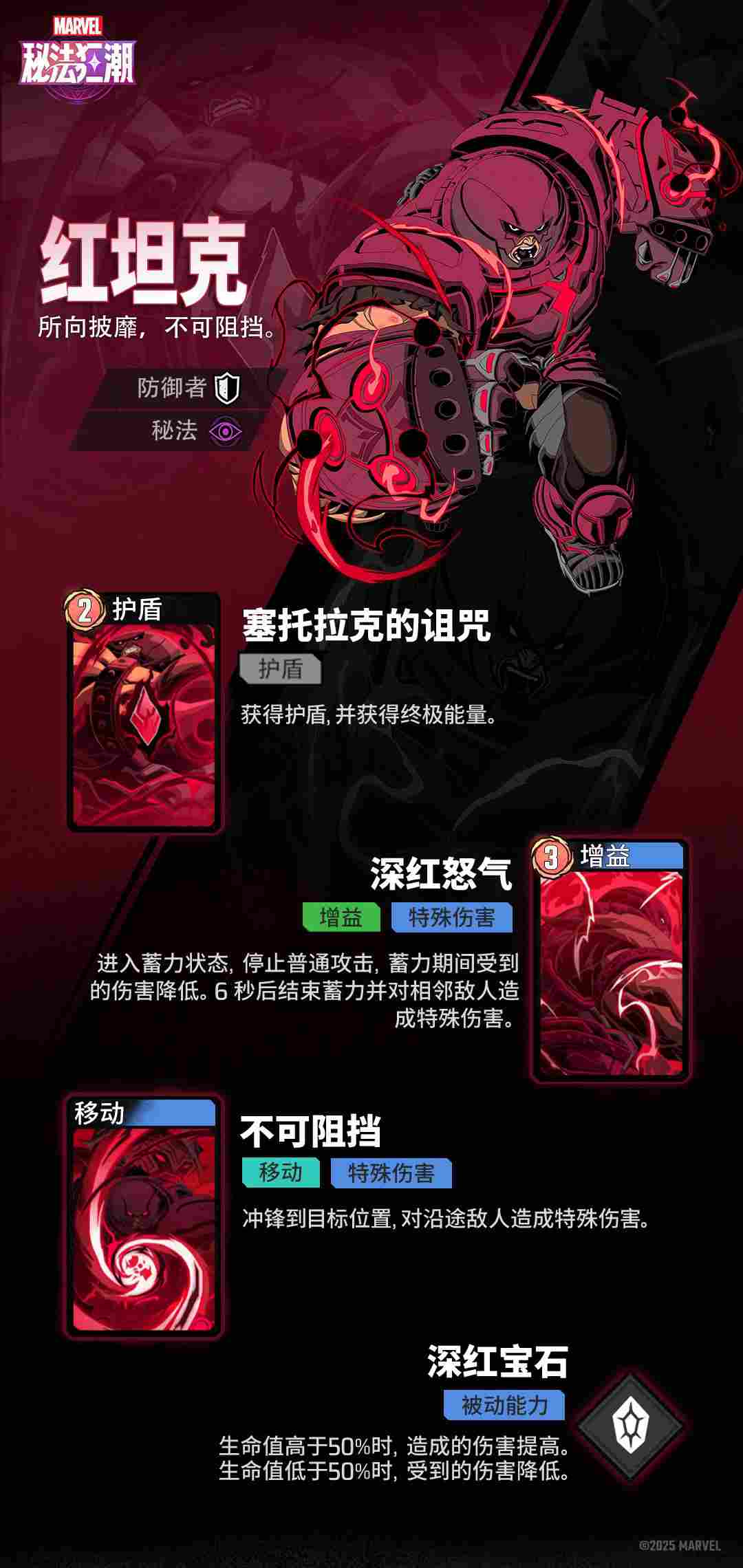 红坦克本名凯因,1950 年朝鲜战争爆发,被军队征召到韩国作战。在战场上意外闯入一个森林中的洞穴,洞穴里有一个古老神殿,神殿里祭拜的是邪神赛托拉克。凯因看到祭坛上供奉着红宝石便触摸了它,获得了赛托拉克的力量变成红坦克。下面是《漫威秘法狂潮》红坦克技能图鉴分享!