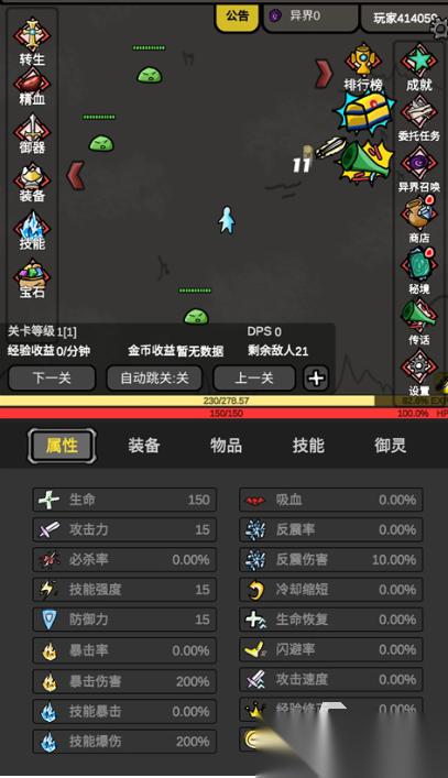 《无限升级》游戏中的每个环节都能不断提高自己的经验值,面对敌人时可以更加的厉害。在游戏中,玩家不需要超快手速打出伤害,也不用依靠身形躲避攻击,只需要装备技能的选择,不断提升装备威力,使得战斗变得更加轻松收集更多的稀有装备。