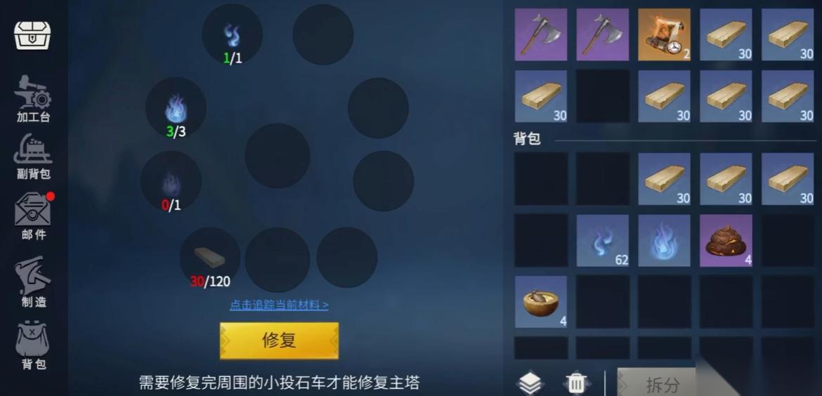 完全修复所有箭塔需要大量材料,包括360个铁杉木、27个残存灵魂、3个完整灵魂等,完整灵魂每次只掉1个所以要打3次BOSS。维修点还要消耗白桦板、铁钉等基础物资。如果觉得压力大,可以优先修桥边两个箭塔提升容错率。龙骨之地外围的升降机手册也是关键道具,记得在40级后尽快获取。