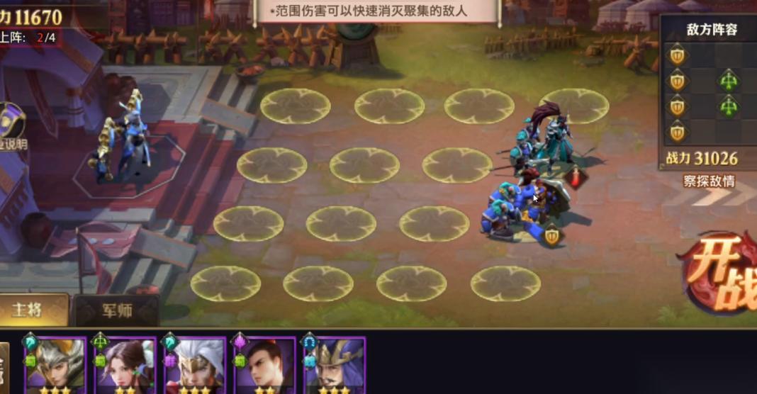 布阵篇的核心在于理解兵种特性与站位策略。敌方阵容通常采用横向排列,盾兵在前排承担伤害,后排弓手构成主要威胁。玩家需要利用重骑张辽的锐不可当技能,该技能可强化同列所有单位的攻击力。将盾兵放置于前排抵挡伤害,重骑负责突破敌方盾兵防线,轻骑则伺机突袭后排弓手。所有武将需集中布置在同一列,以最大化技能收益。轻骑兵对弓手与谋士有暴击加成,适合针对后排输出;重骑兵首次接战可造成无视防御的伤害,是突破前排的关键;盾兵提供护盾值保障生存,步兵则需配合近战单位触发攻击增益。谋士类武将可降低计谋伤害并施加控制效果,但需远离前线。