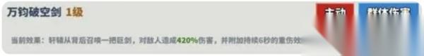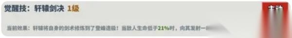 描述:轩辕将自身的剑术修炼到了登峰造极!当敌人生命低于21%时,向其发射一枚飞剑,直接终结这名敌人!