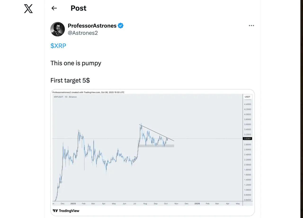 分析师阿斯特罗内斯教授相信XRP可能很快就会创下历史新高。他描述其当前设置为“泵浦”,并补充说代币正在形成看涨结构,可能会推高价格。
