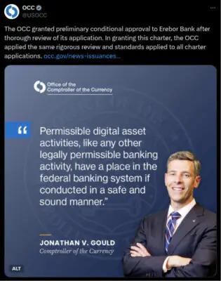 授予 Erebor 许可证的举动可能表明 OCC 正在转向更加加密友好的策略。