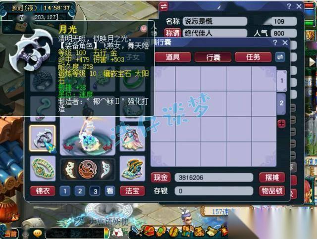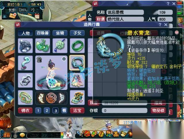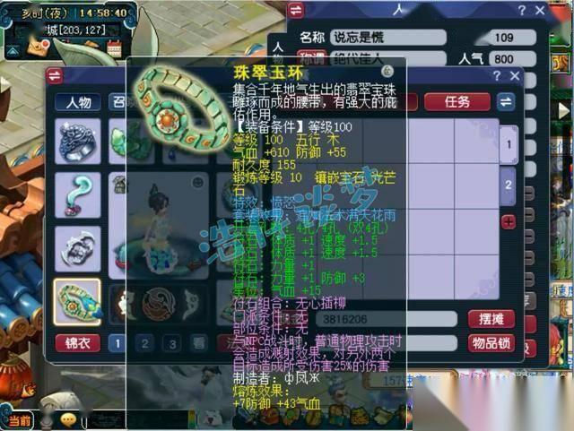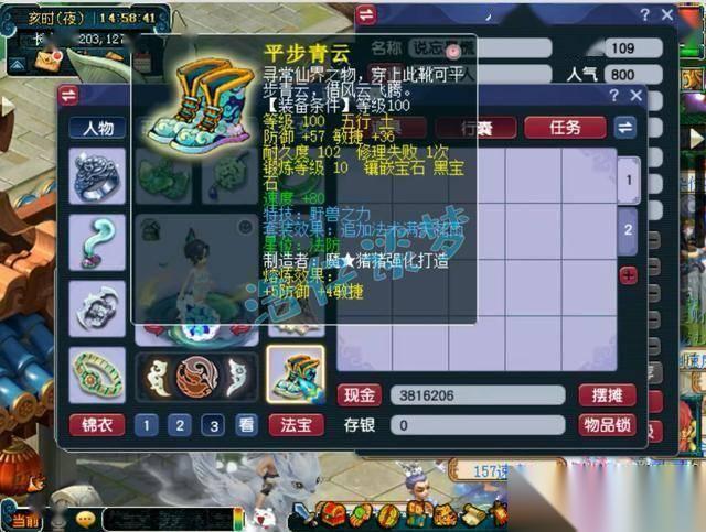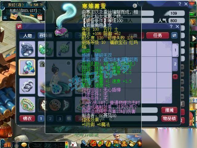 100级带凝心诀的满天花雨套女衣,熔炼后力体双加41,打了10锻月亮石。