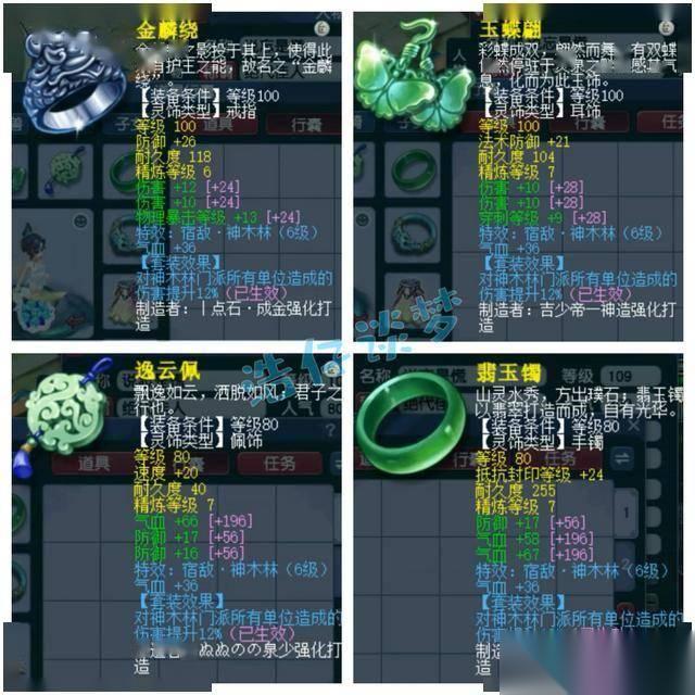 戒指下排双伤害一物暴,耳饰下排双伤害一穿刺,配饰下排双防御一气血,手镯下排双气血一防御,特效选择了6级宿敌神木林。