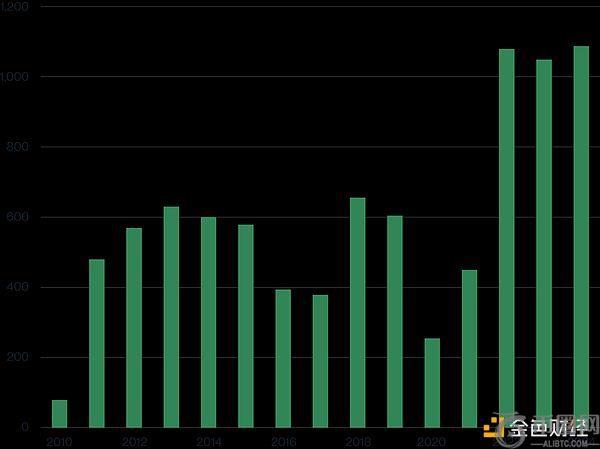 请看下方表格,该表格展示了2010年至2024年各国央行的年度黄金购买量。2021年央行购金量为467吨,2022年跃升至1080吨,此后一直保持在这一高位(预测显示2025年的需求将略低于2024年)。