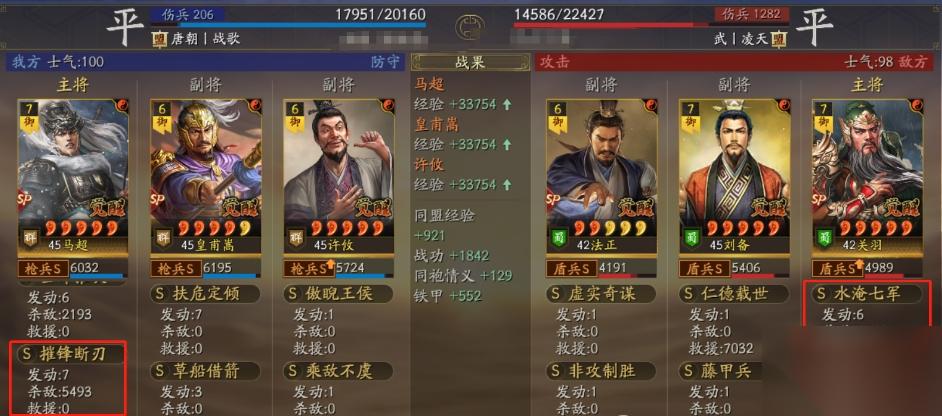 摧锋断刃在重复施加给敌方单个武将时,敌人的降伤效果能叠到百分之九十。因此它很适合给皇马中的SP马超用,再加当锋能轻松抬走对面法关以及杀马。至于阵容中的SP皇甫嵩可以带草船以及临危,许攸用乘敌不虞和解烦卫就行。注意SP马超用摧锋的时候,必须保证敌将武力低于自身才可触发降伤。比如对面的SP关羽武力大于我方马超的情况下,就算吃到摧锋也不会被附上降伤效果。摧锋皇马在打内战的时候,SP马超的神威特技有了一定的用武之地。