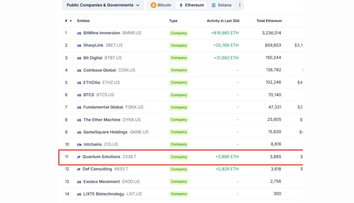 Quantum Solutions 的快速增长使其成为日本领先的上市公司以太坊根据 CoinGecko 的数据,DAT 是全球第 11 大加密货币。虽然以太坊是其主要持有资产,但该公司也持有较小规模的比特币国库余额为 11.6 BTC,价值约 130 万美元。