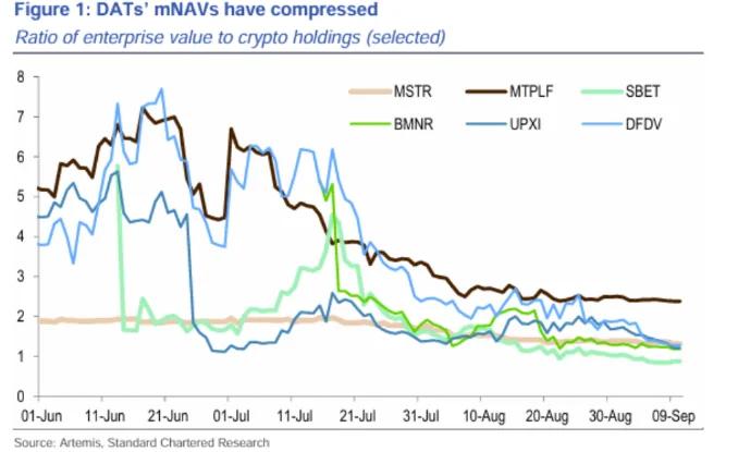 渣打银行分析师警告称,随着市场净资产价值下降,许多DAT公司可能面临估值压力。DeFi Development Corp.被列为目前估值压缩的公司之一。