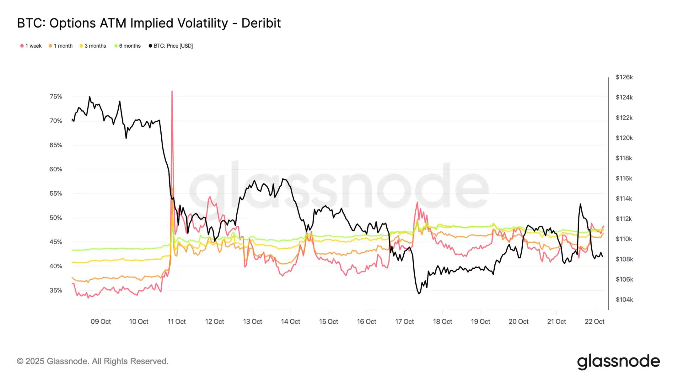 自 10 日的清算事件以来,波动率格局已明显改变。隐含波动率现在各期限均位于 48 左右,而两周前仅为 36-43。市场尚未完全消化这次冲击,做市商保持谨慎,并未廉价出售波动率。
