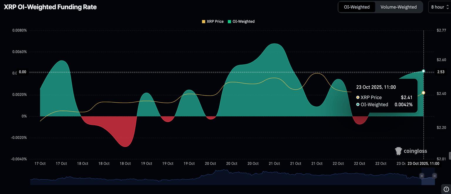 与此同时,散户对XRP的兴趣也在价格波动中有所增长。CoinGlass数据显示,周四期货未平仓合约(OI)加权融资利率为0.0042%,高于周三的-0.0007%。