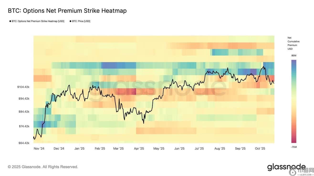 并非所有投资者都持乐观态度。比特币期权净溢价流入数据显示,BTC 当前交易区间 109,000 美元至 115,000 美元之间面临巨大的抛售压力。