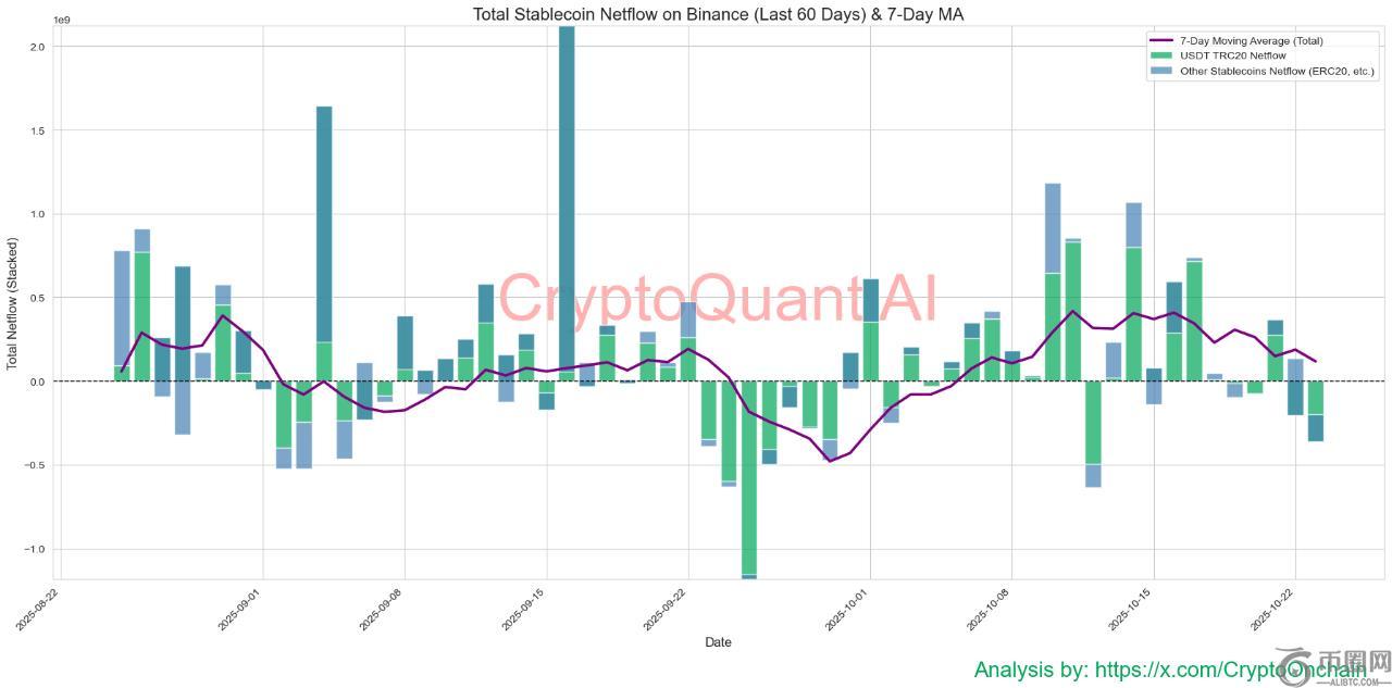根据 CryptoOnchain 的数据,稳定币净流量(紫线)的 7 天移动平均线已果断跌破“零”关口,标志着从持续流入转向加速流出。