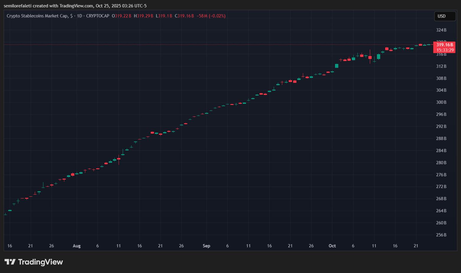截至本文撰写时,全球领先的加密货币比特币的估值约为 111,400 美元,过去一天价格小幅上涨 0.54%。以太坊在过去 24 小时内也呈现类似的小幅上涨,目前价值约为 3,936 美元。与此同时,稳定币的总市值在过去一天上涨 0.14% 后,仍保持在 3,190 亿美元。