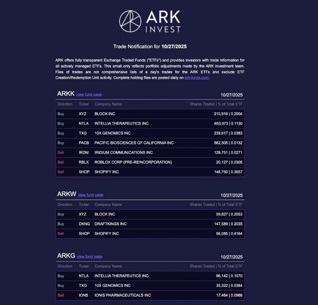 2025年,ARK多次在Coinbase平台进行交易,又多次退出。本周,它倾向于Block和Robinhood平台。这一转变表明,ARK的关注点正在转向支付网络和更便捷的零售渠道,而不仅仅是传统的交易所。